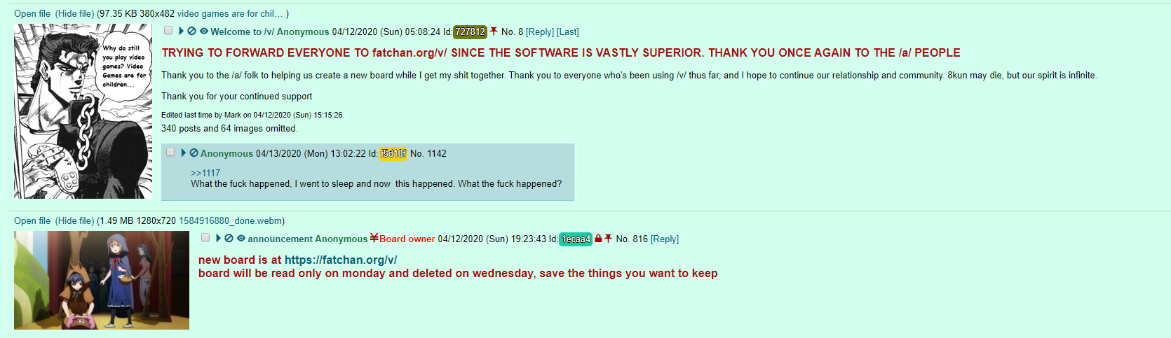 avatarfag: someone using a consistent avatar (eg, a certain anime character) to identify themselves. avatarposting: the act of posting as an avatarfag. capcode: a special string in the name field which identifies the poster as a member of staff. chan: imageboard. dubs: a post number with a pair of repeating digits. GET: guessing your post number to be a satisfying value (eg, “dubs GET”) fullchan: 8chan. See halfchan. halfchan: 4chan. See fullchan. liveboard: an imageboard where posts are updated in real-time as people type, using javascript. modpost: a post with a capcode. Can also be used as a verb (“to modpost”). namefag: someone using a name to identify themselves. newfag: new user. noko: included in the email field to return to the thread, not the board index, after posting (some imageboards (like lainchan) do this automatically). oldfag: old user. sage: included in the email field to not bump a thread when posting. Can also be used as a verb (“to sage”). samefag: someone posting in a thread acting as two or more different people, typically to provoke argument by arguing the extreme of each side until others are drawn in. Can also be used as a verb (“to samefag”). trip: a tripcode. tripcode: a hashed password included in the post name field to identify the poster. tripfag: someone using a tripcode to identify themselves, but especially someone doing so when unnecessary, or someone re-using the same tripcode across multiple threads. Can also be used as a verb (“to tripfag”). trips: a post number with a trio of repeating digits. vichan: a popular PHP imageboard program.